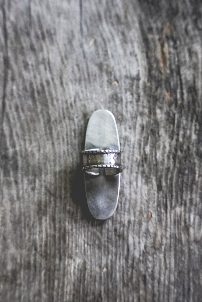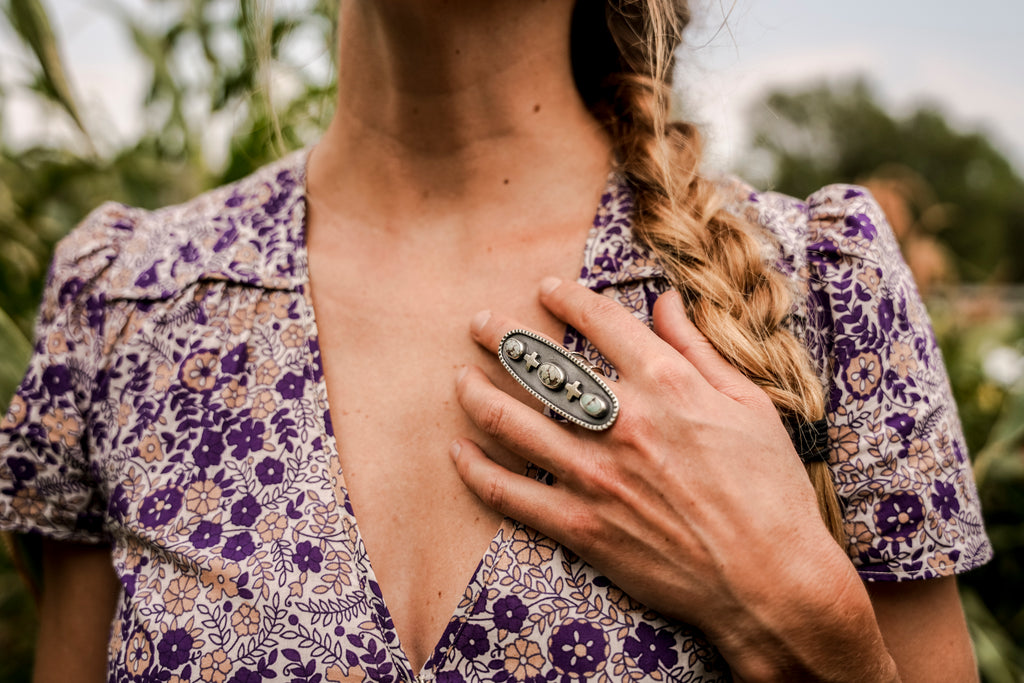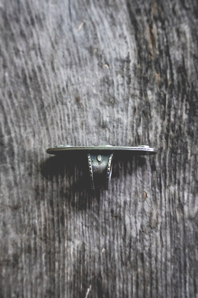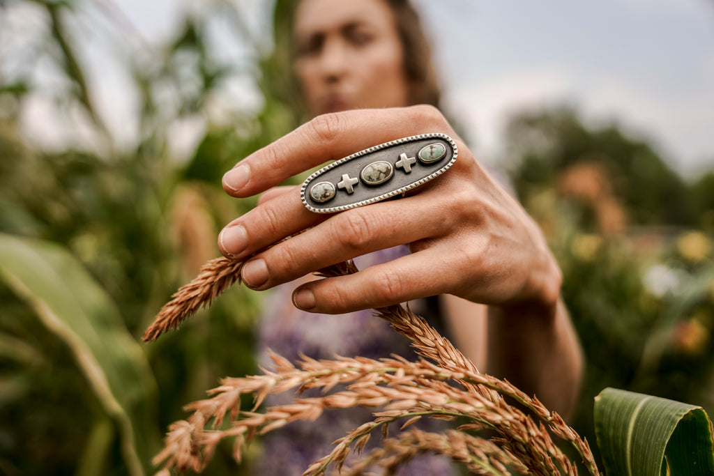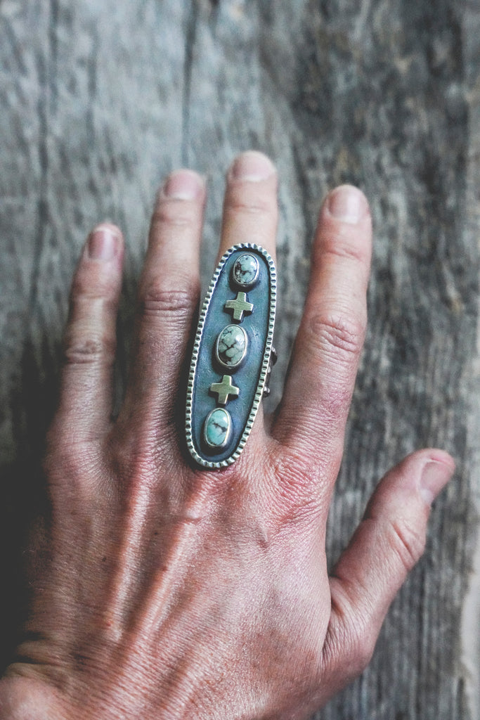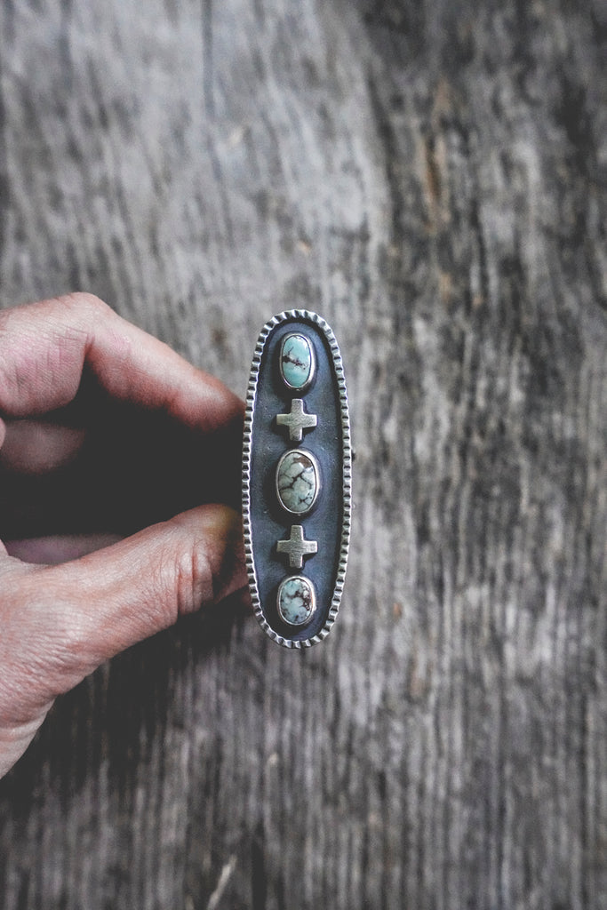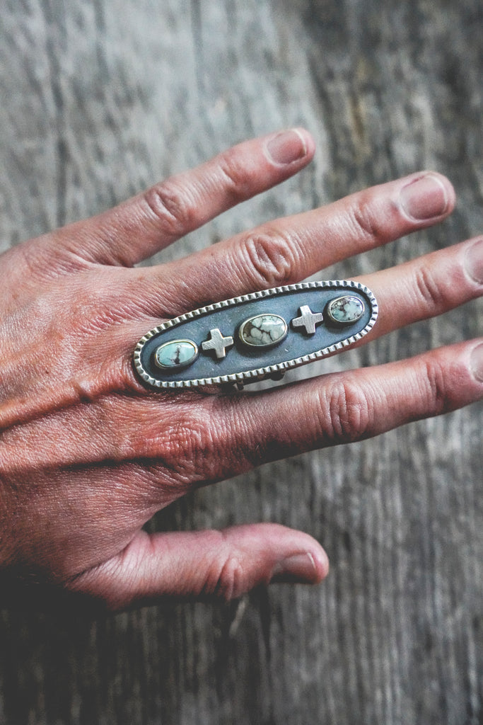 This is a heavily constructed ring featuring three cuts of Number Eight Mine Turquoise in a pale, sage green hue that is speckled with warm brown matrix. Earthy and steadfast.