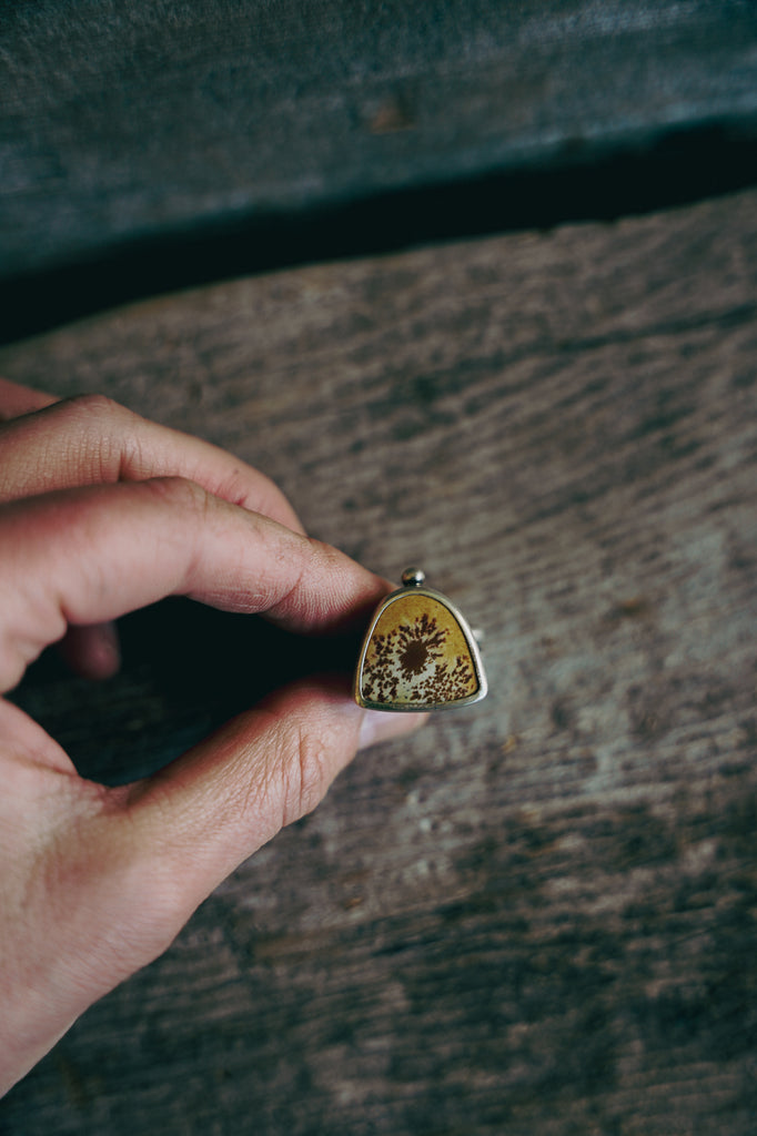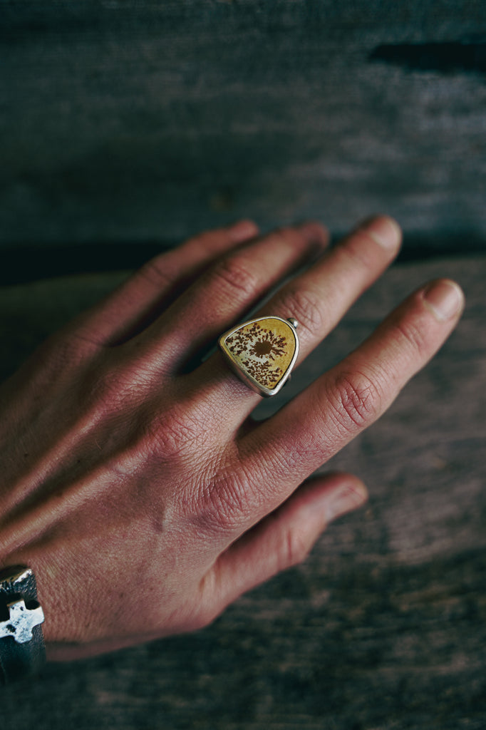 This ring features a cut of Owyhee Jasper and I've set it in simple sterling on a heavy band -- a spare setting that speaks to the spareness of the steppe country -- a place where beauty resides but is slow to emerge. Sometimes I like to let a stone do all the talking.