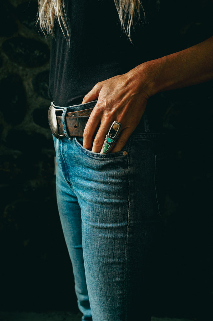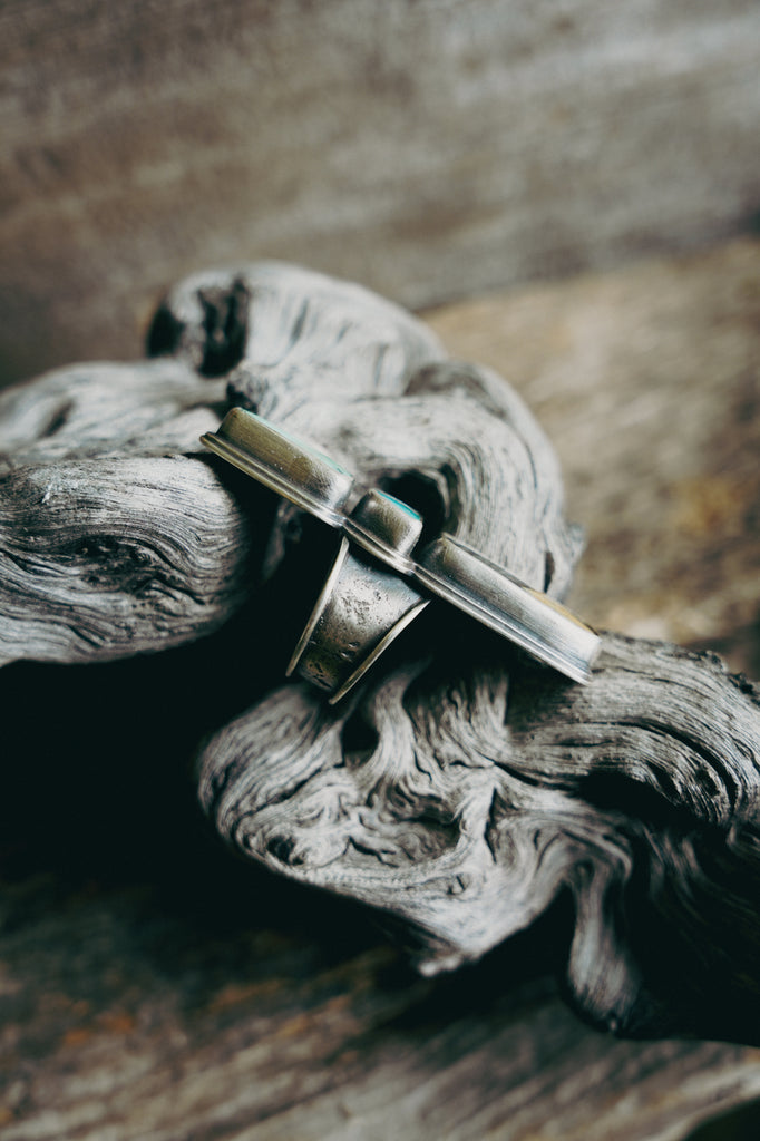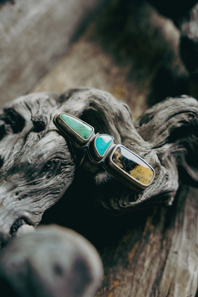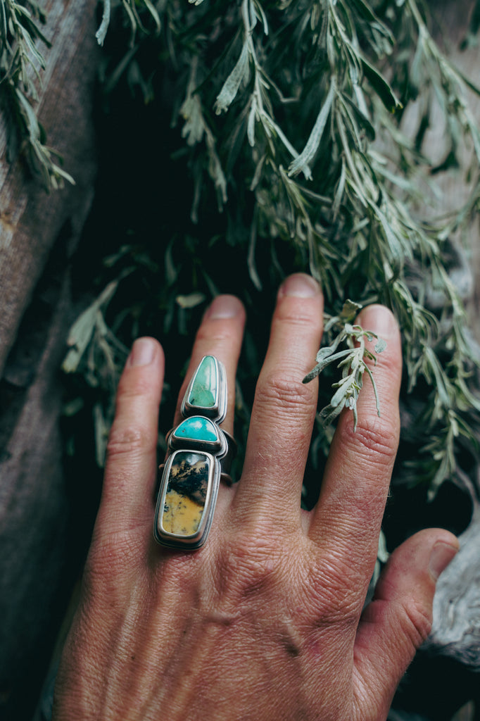 Well, I love this ring. I love the combination of stones, the geometric shapes of the cuts, the lay of this ring face on the finger. Everything about it. I've combined a cut of Angel Wing Variscite with Blue Gem Turquoise and a buttery cut of dendritic opal that bears a clear pocket with inky dendrites. All this beauty perches atop a hefty band. I can't tell you this ring will grant you immortality but it will come pretty darn close. Made for a queen. Wear it well and make me proud.