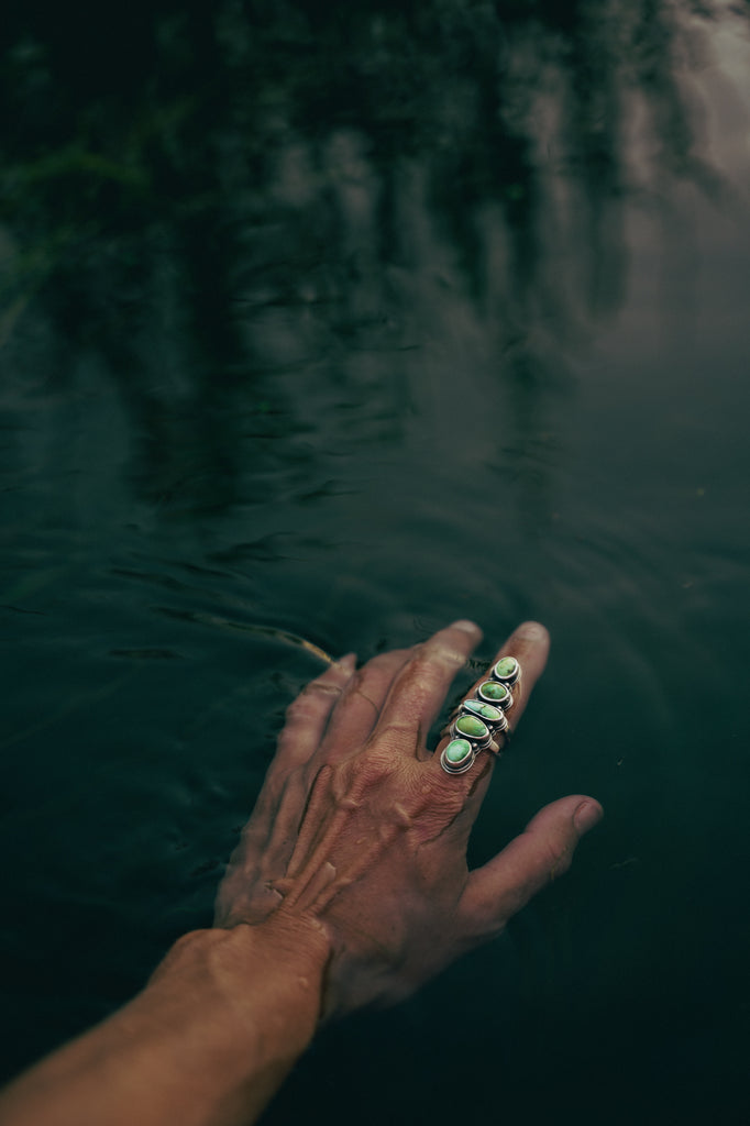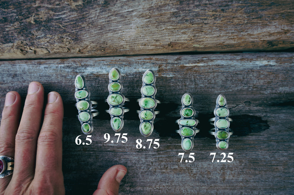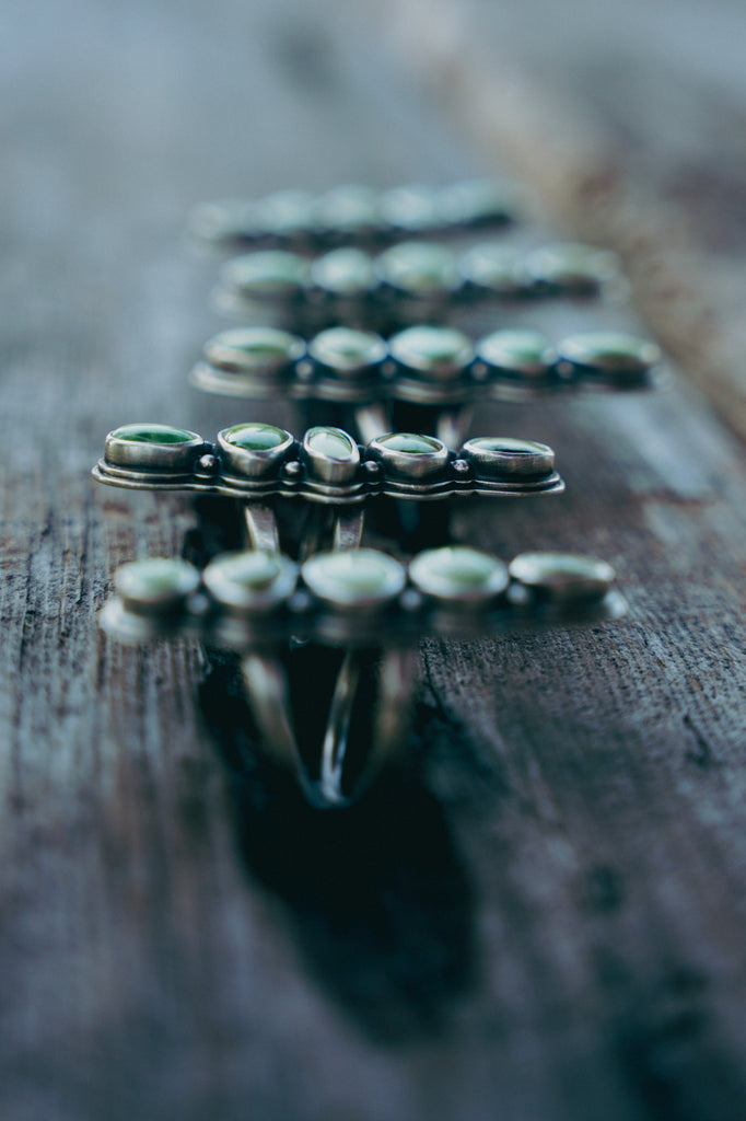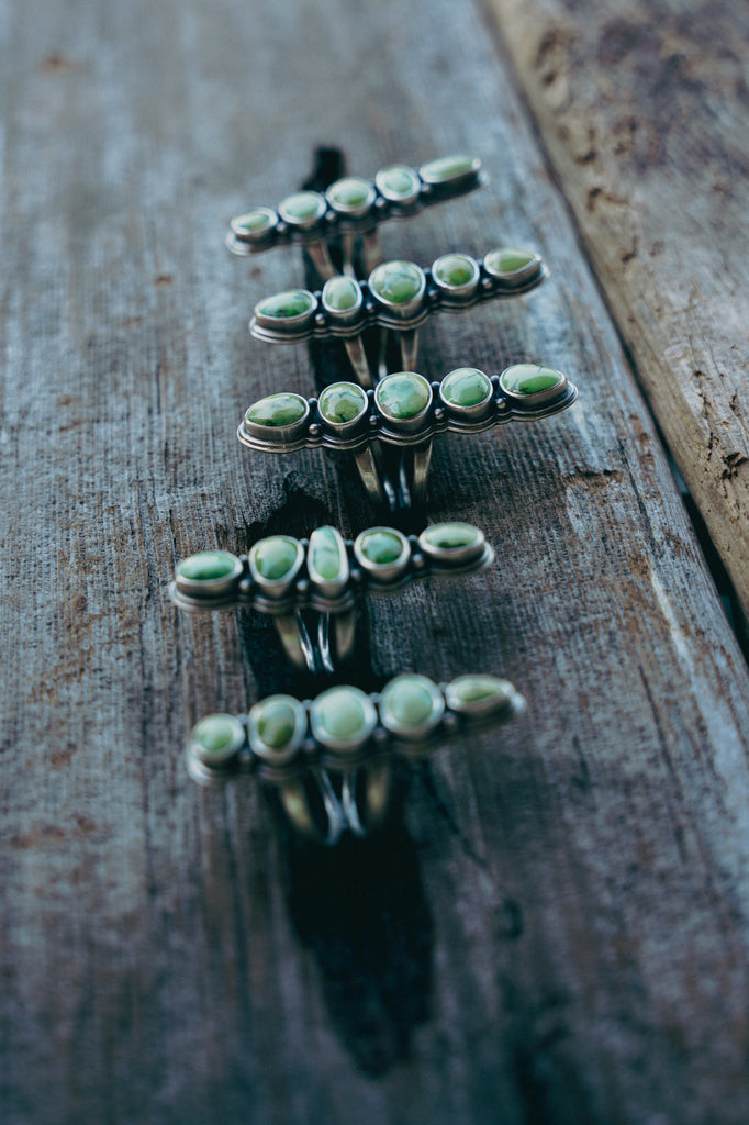 Fresh cuts of Sonoran Sunrise atop split-shanks bands -- heavily built (as always) but wonderfully elegant. The color of these stones is as refreshing as dragging an open hand through the easy current of a spring creek which happens to be exactly what I was doing when I took some of these photos.