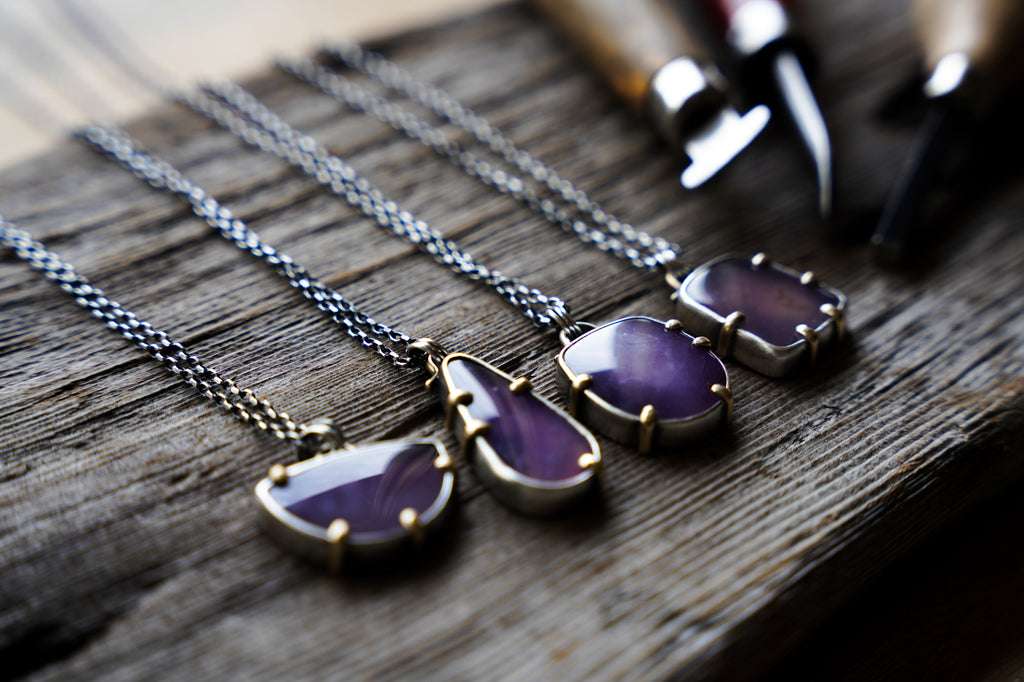 There's not much of a story behind this necklace design except I've been playing around and trying some new things in my studio this spring which has been quite refreshing. These are beautiful cuts of Purple Salvia Chalcedony which is a little like amethyst but STORMY. I've sent them crisply in heavy sterling settings with contrasting jeweler's brass prongs. Simple and beautiful.