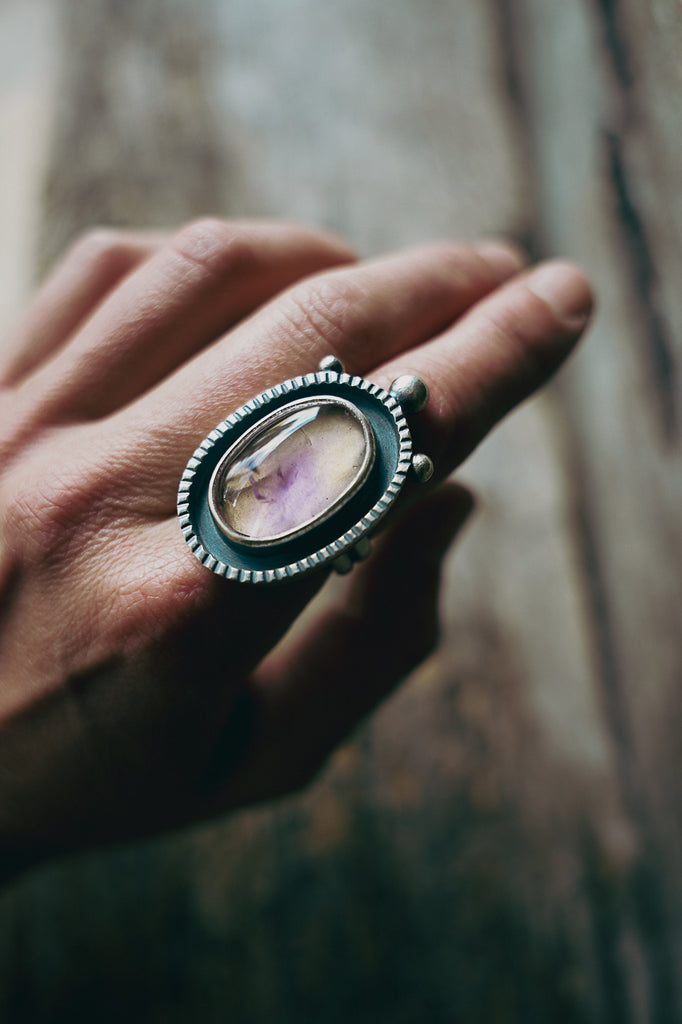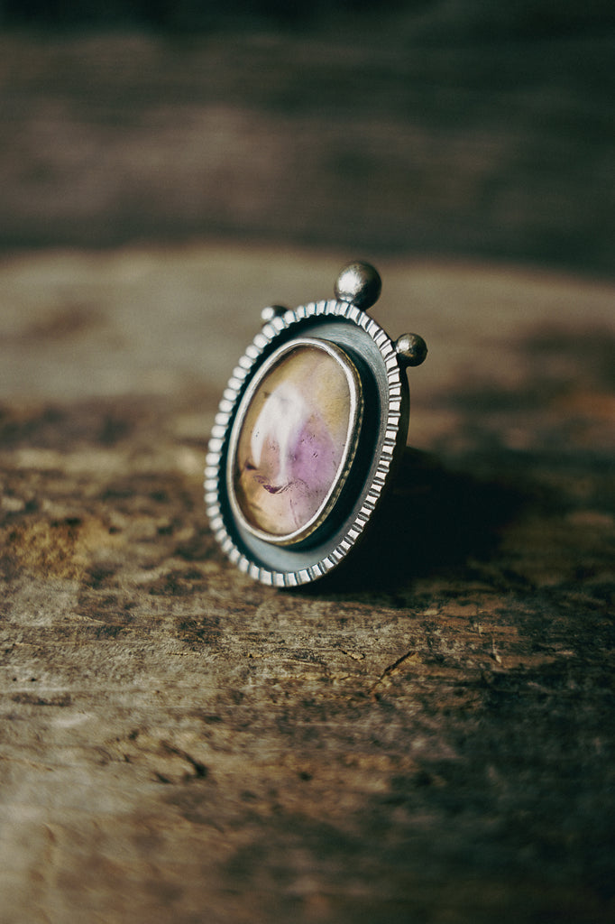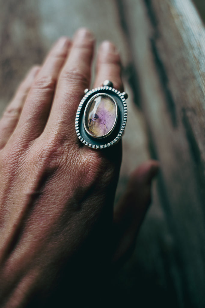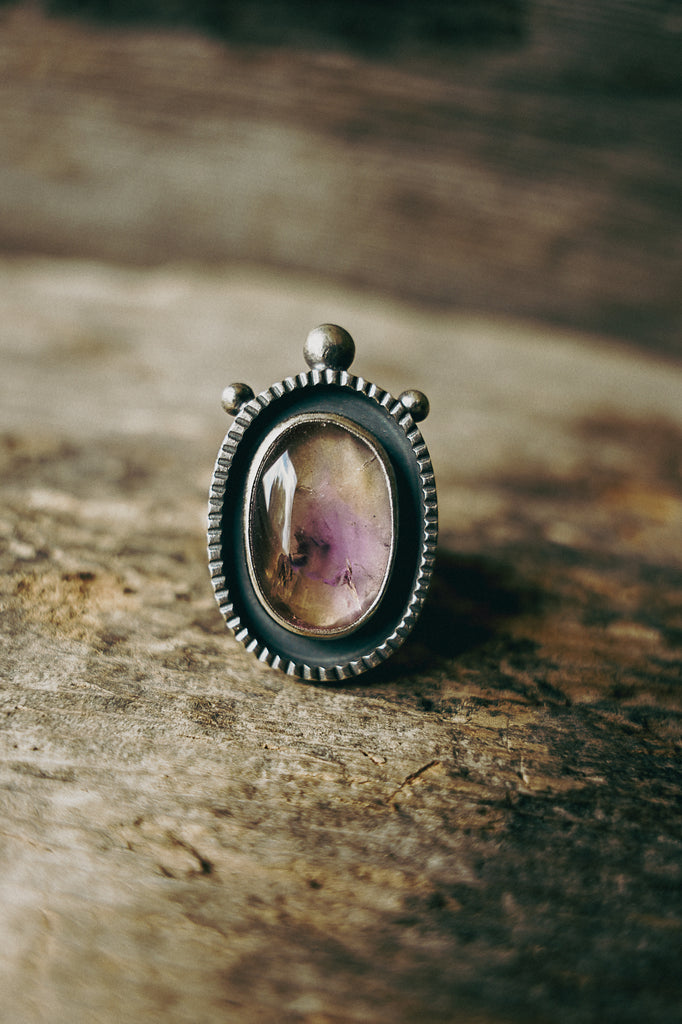 Sterling silver and a beautiful cut of ametrine which is a blend of amethyst and citrine.