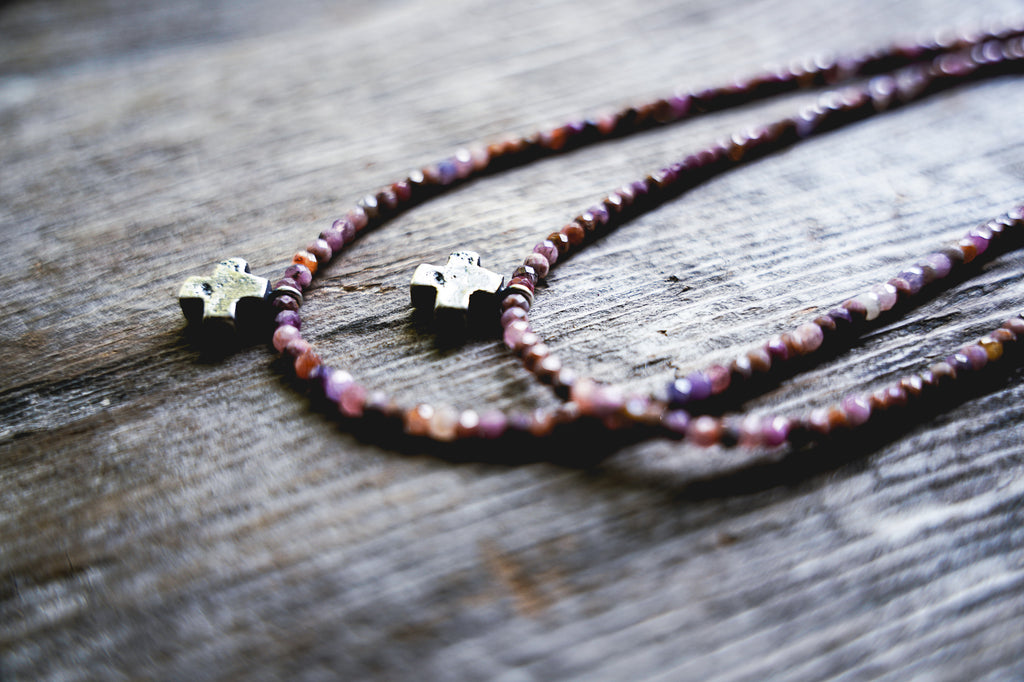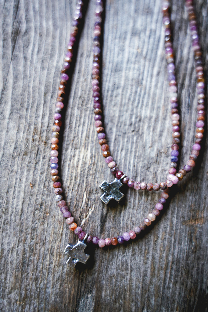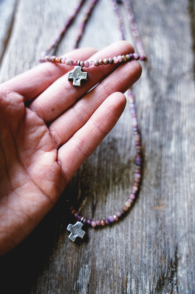 Earthy ruby beads paired up with my gritty sterling square cross and sterling silver finishes.
