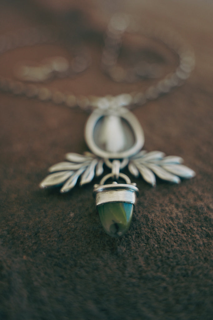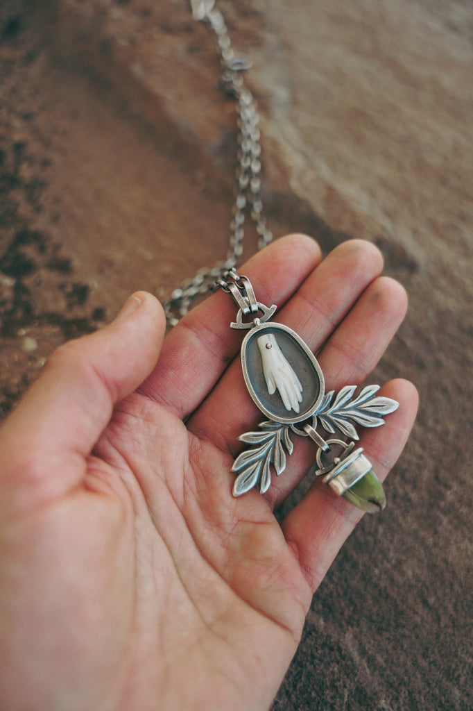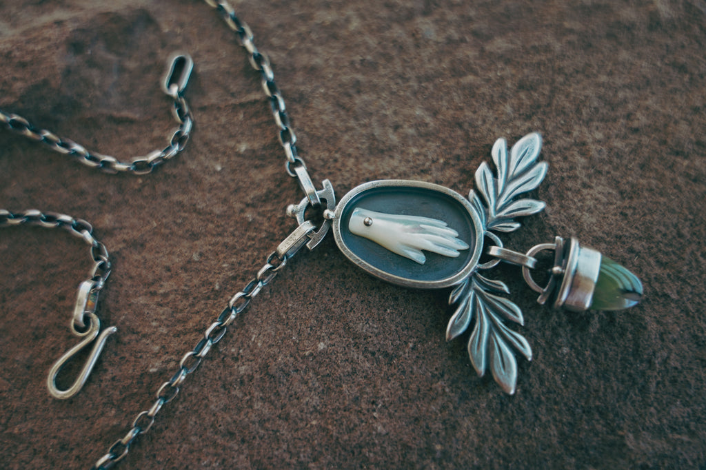 This necklace features a carved mother of pearl hand, a really lovely chrysoprase tongue that is difficult to capture by camera but lovely nonetheless and some of my juicy leafy sprigs. This piece has a beautiful weight to it and complex, geometrical connection points built of sterling silver arcs.