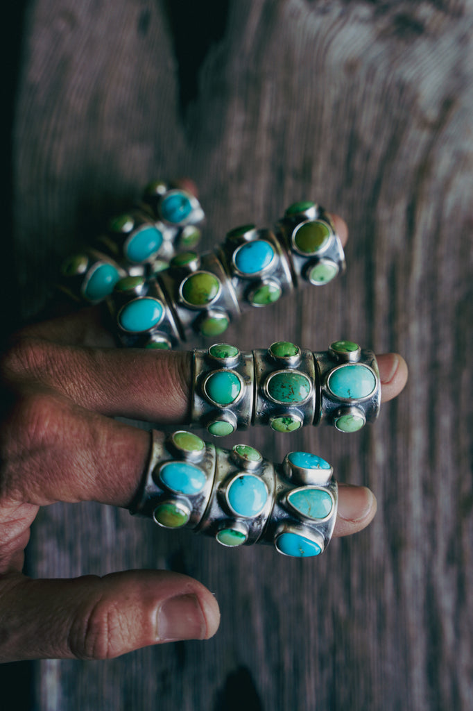 I named them the Tomboy Rings because they're not exactly masculine in design but I built them strong and tough and pretty. These rings feature a myriad of American turquoise and Sonoran Sunrise set atop heavy 16 gauge sterling bands. I made them for all the gals out there who have been fortunate enough to spend their lives climbing trees, setting snares, tearing their jeans, catching tadpoles, aggravating wasp nests, squashing pennies on the train tracks, swimming' in the river or practicing some creative cussing in the shade of a caragana bush.
