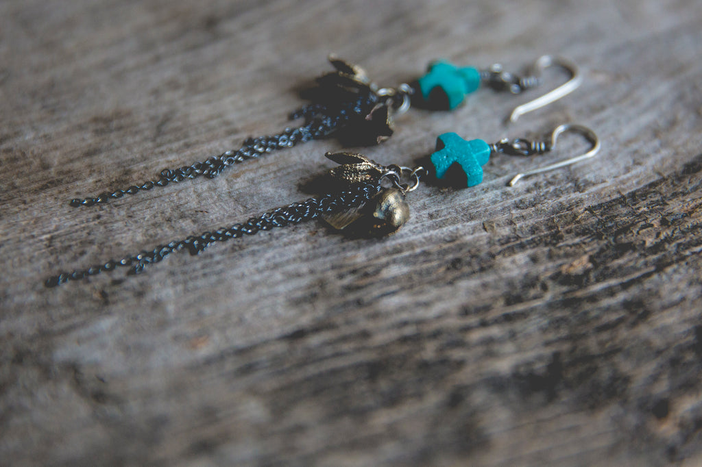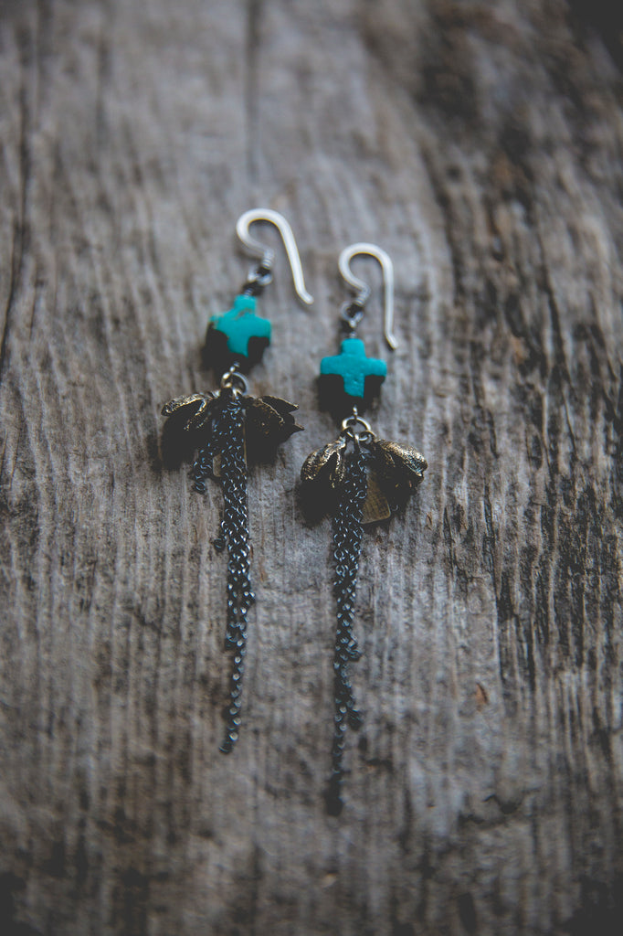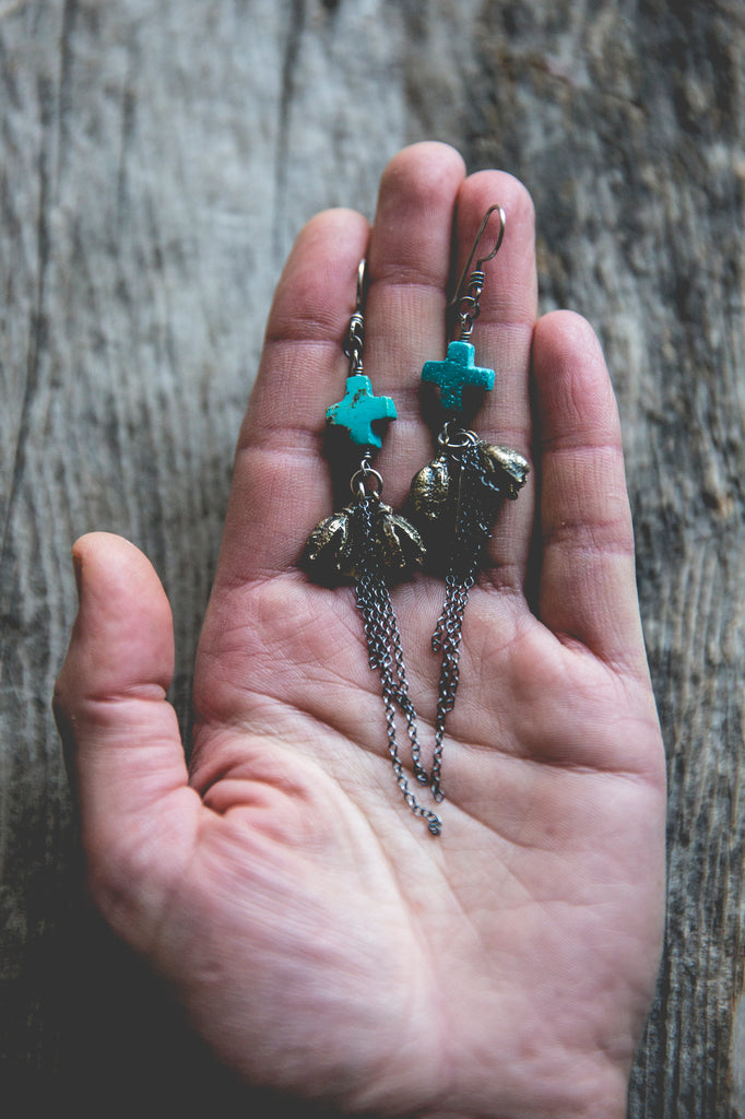 Beautiful cast brass yucca pods, swaths of sterling fringe and OLD hand carved turquoise crosses that look as though they were whittled by the wind. The more primitive the better!!! Just beautiful. Every bead in this particular strand of beads was utterly unique in size, shape and matrixing so I did my best to pair them up accordingly but you'll find that each pair is one of a kind. I can only hope I am able to find old deadstock like this again someday. Keep your fingers crossed for me!