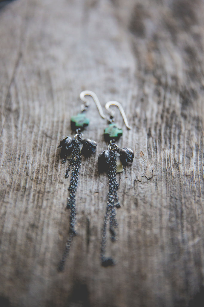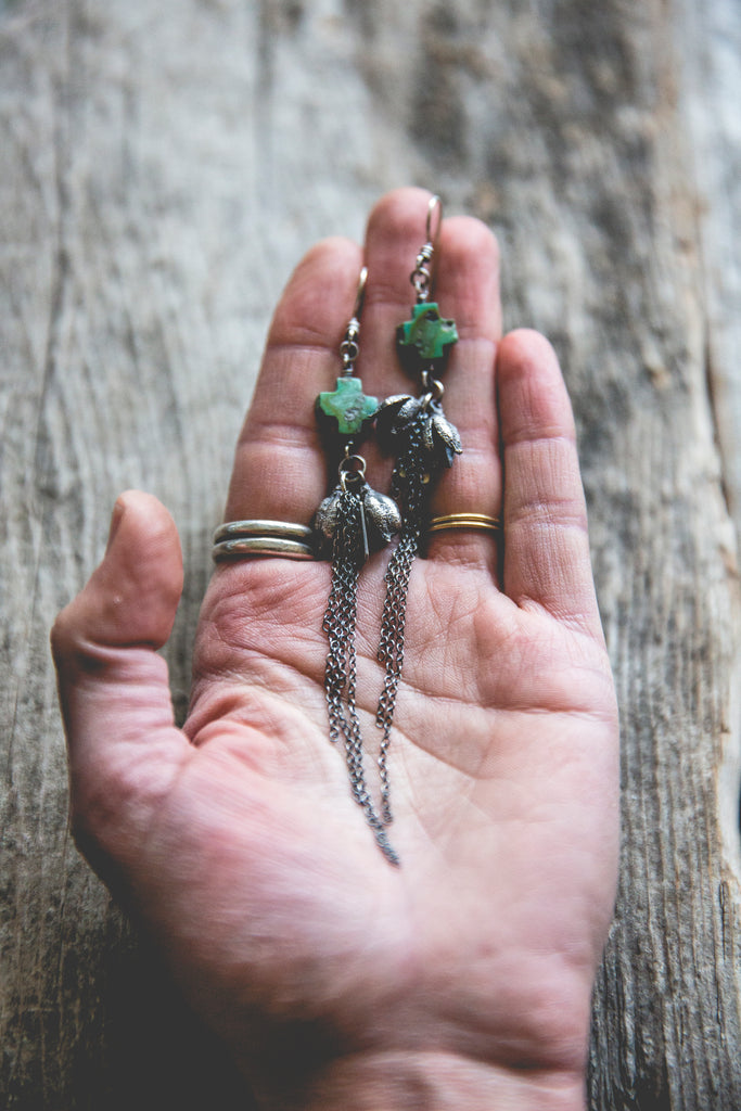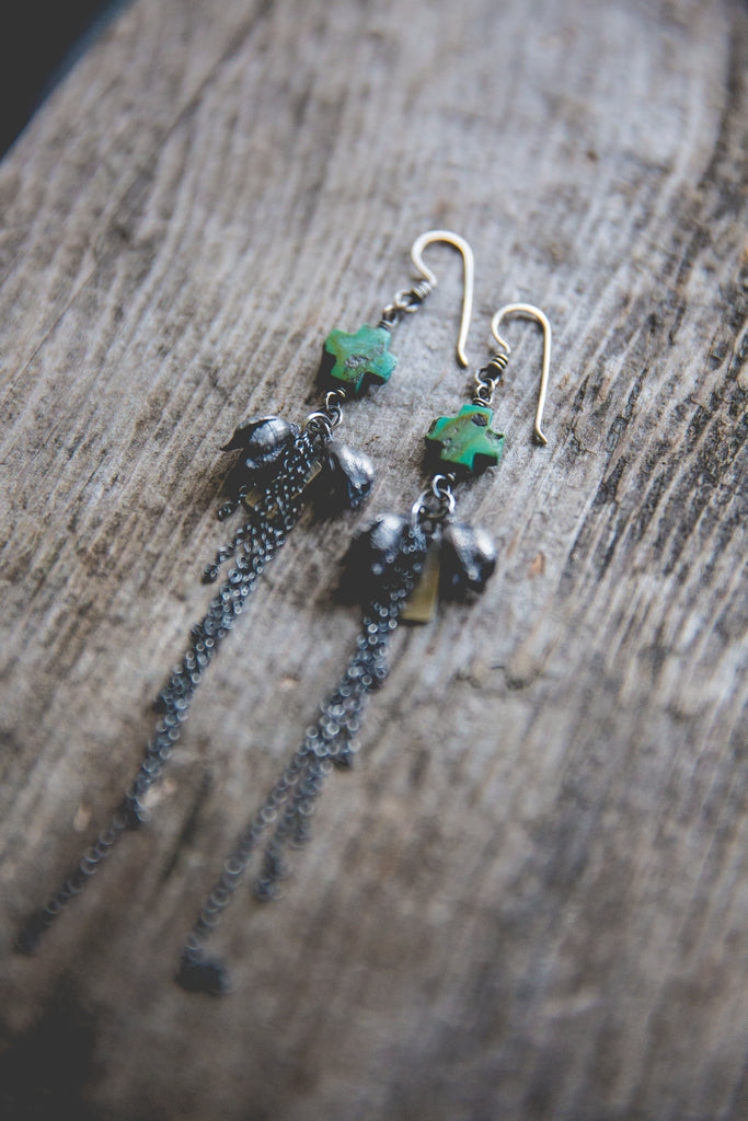 Beautiful cast sterling silver yucca pods, swaths of sterling fringe and OLD hand carved turquoise crosses that look as though they were whittled by the wind. The more primitive the better!!! Just beautiful. Every bead in this particular strand of beads was utterly unique in size, shape and matrixing so I did my best to pair them up accordingly but you'll find that each pair is one of a kind. I can only hope I am able to find old deadstock like this again someday. Keep your fingers crossed for me!