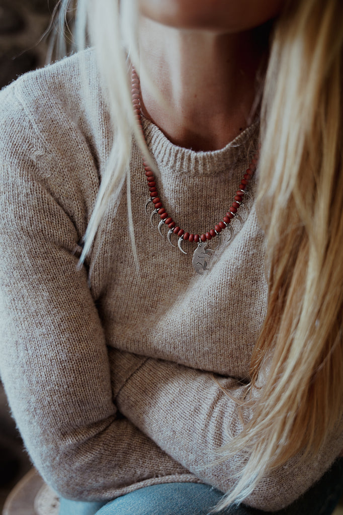 This necklace was loosely inspired by a bear claw necklace a Chippewyan woman made for my sister when my family was stationed up in Fort Chippewyan, Canada. It wasn't a work of art by any means. The woman simply drilled some bear claws and strung them intermittently with red wooden beads on fishing line, but there was something magical about that necklace. It captivated me and I have coveted it all these years.
