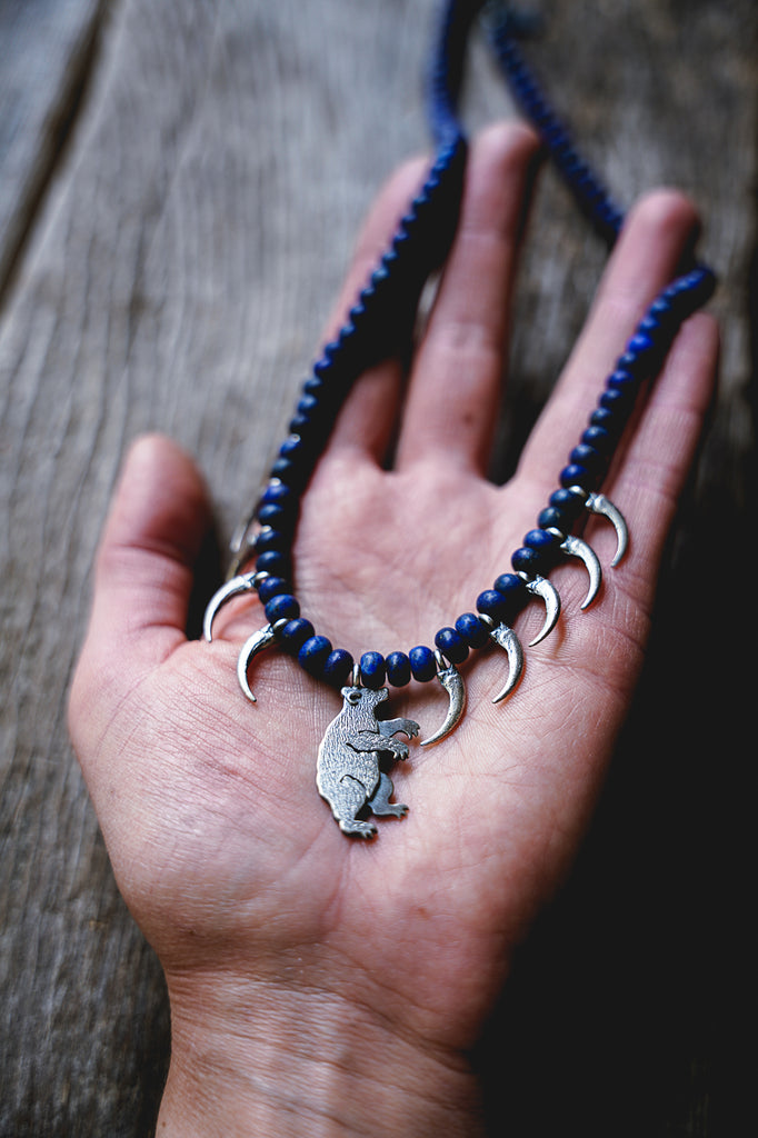 Here's my take on that old bear claw necklace featuring one of my growly little sow charms that I've flanked with ten sterling hawk talons. The effect is pretty wild looking and surprisingly elegant. Chunky lapis lazuli beads give this piece extra presence.