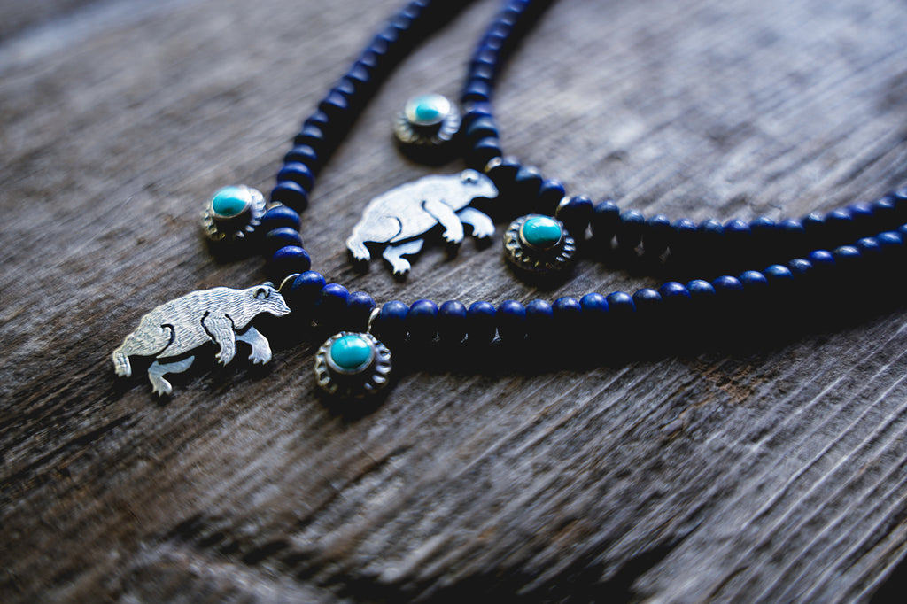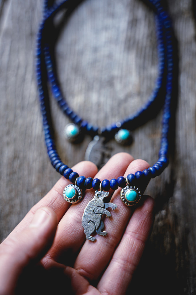 This growly little sow is paired with a couple of turquoise sun charms and strung with chunky, lapis lazuli beads. May she help keep you wild and free.