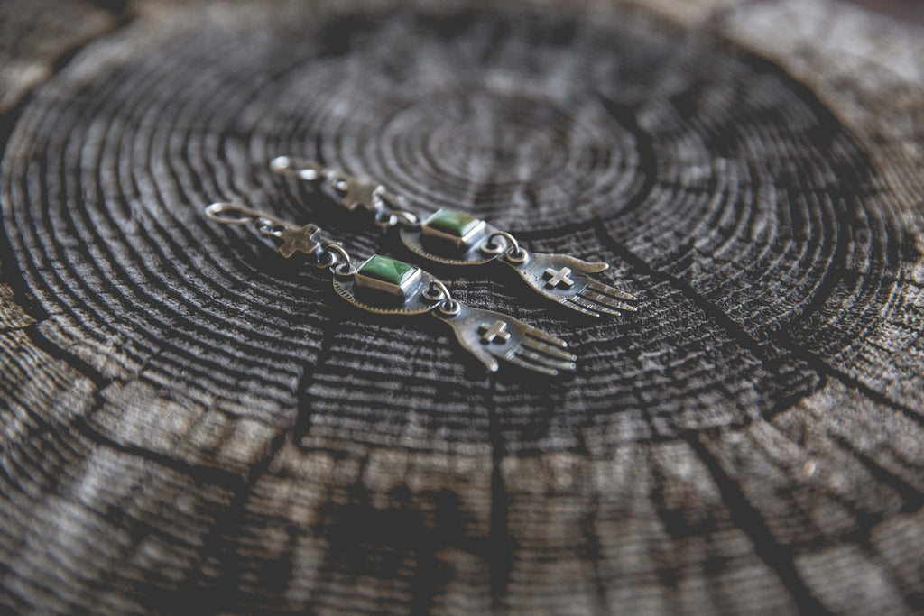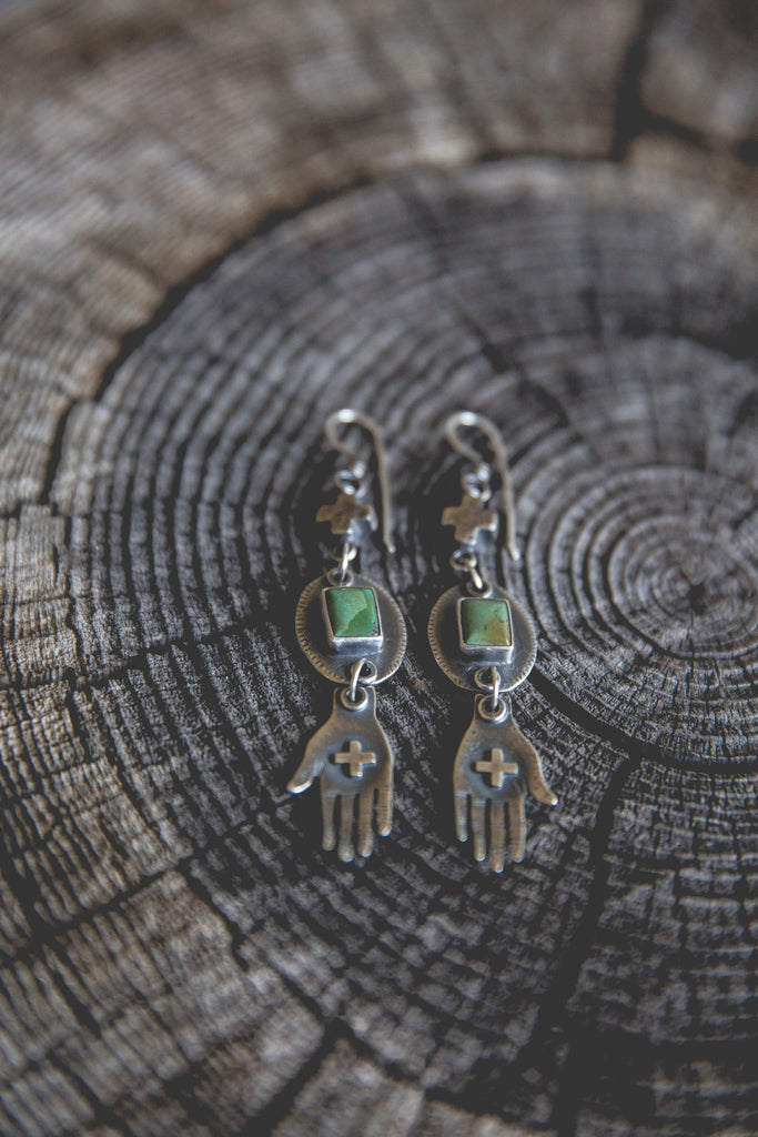 My Vocation Earrings are built of a myriad of tiny parts: a hand milago that bears a cross, earthy turquoise and a cast sterling cross. All my trademark textures give these earrings an old timey feel.
