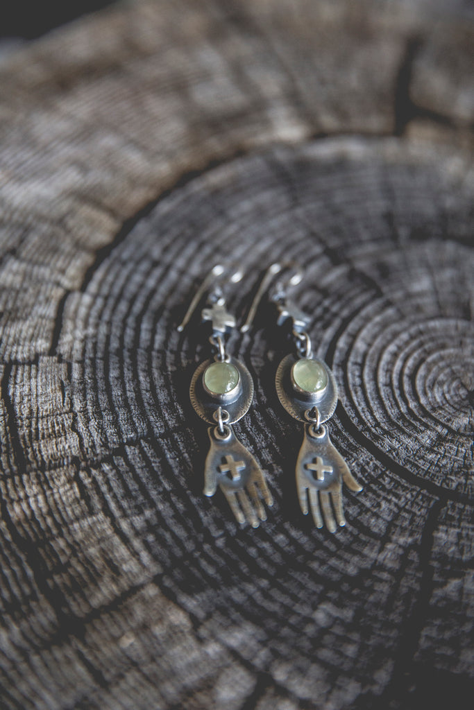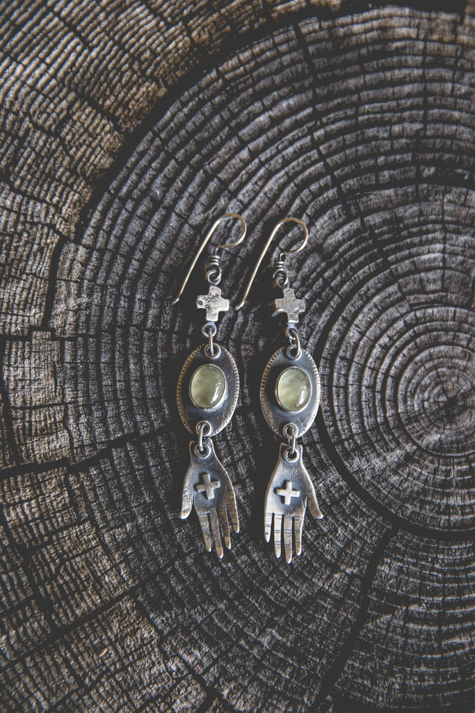My Vocation Earrings are built of a myriad of tiny parts: a hand milago that bears a cross, luminous turquoise and a cast sterling cross. All my trademark textures give these earrings an old timey feel.