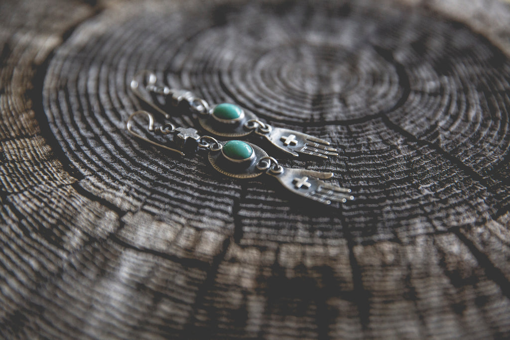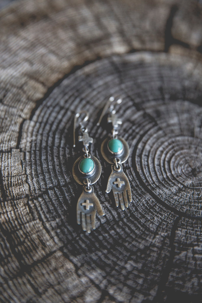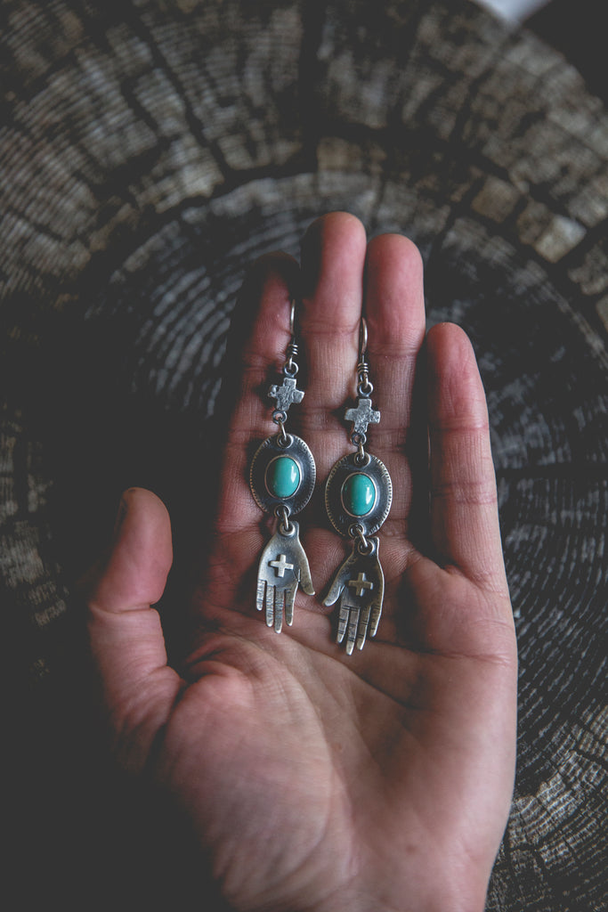 My Vocation Earrings are built of a myriad of tiny parts: a hand milago that bears a cross, turquoise like the summer sky and a cast sterling cross. All my trademark textures give these earrings an old timey feel.