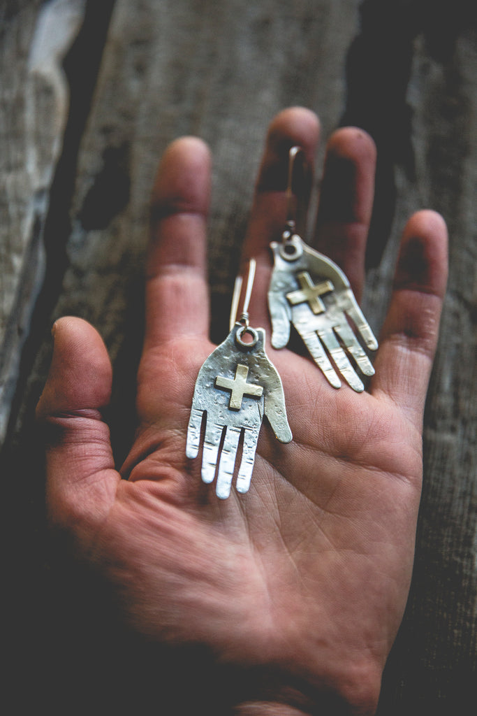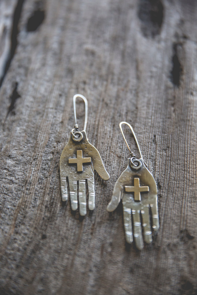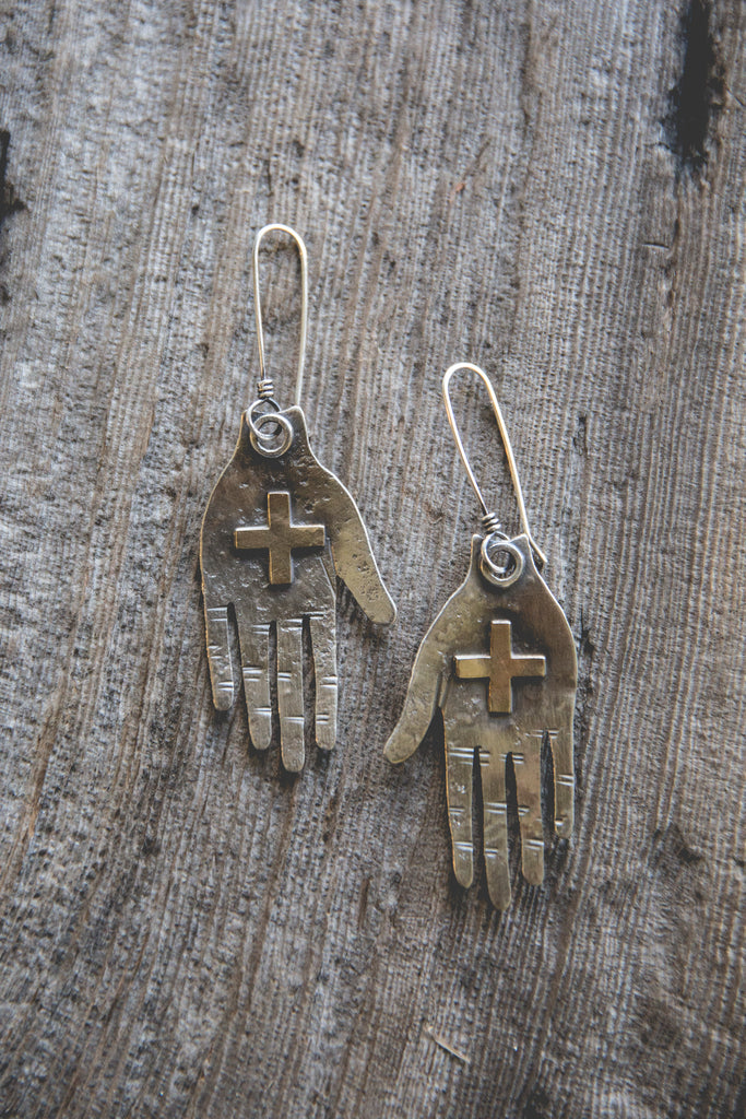 Simple, open hands bearing up brass crosses in true milagro style. All my trademark textures give these earrings an old timey feel.