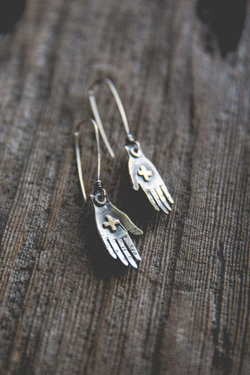 Simple, open hands bearing up brass crosses in true milagro style. All my trademark textures give these earrings an old timey feel.