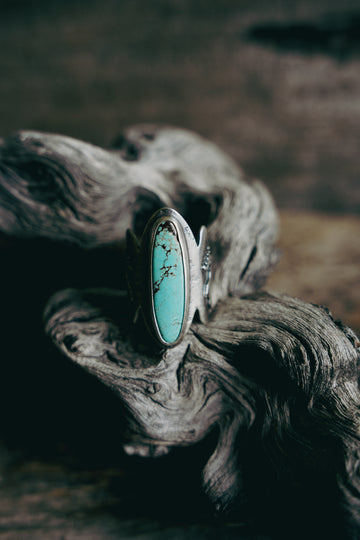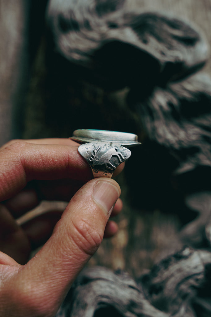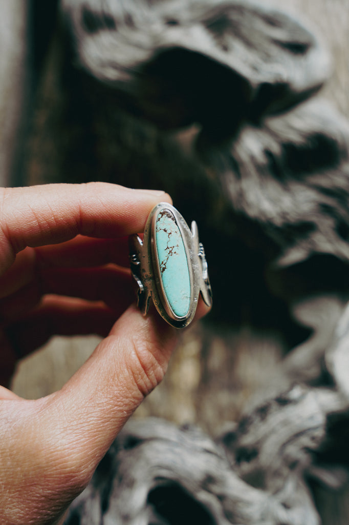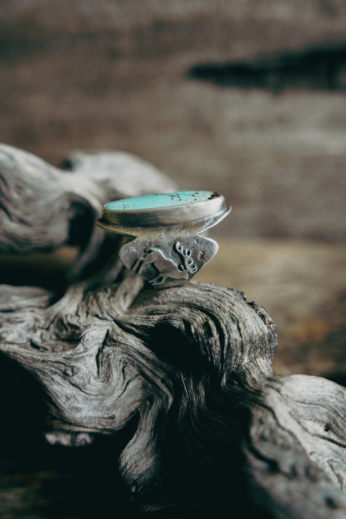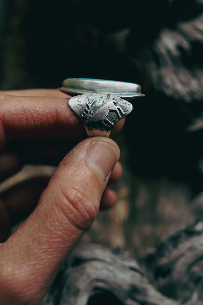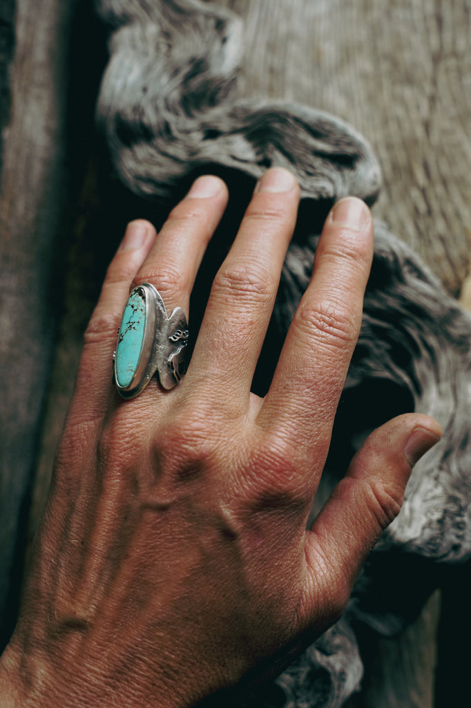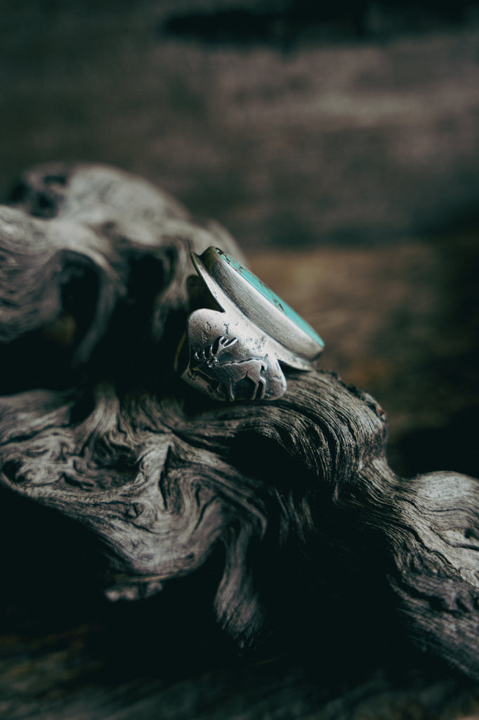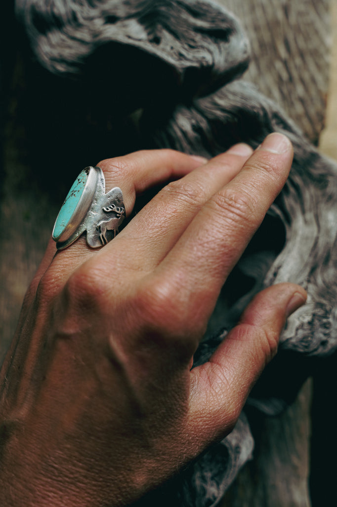 I made this ring on a whim, with reverence in my heart for this incredible animal, and I like how it turned out. It features an elegant, elongated cut of American turquoise which is flanked by a pair of bull elk on a new band shape I've been trying out here. Lots of dimension, grit and grace here. I know you'll wear this piece well.