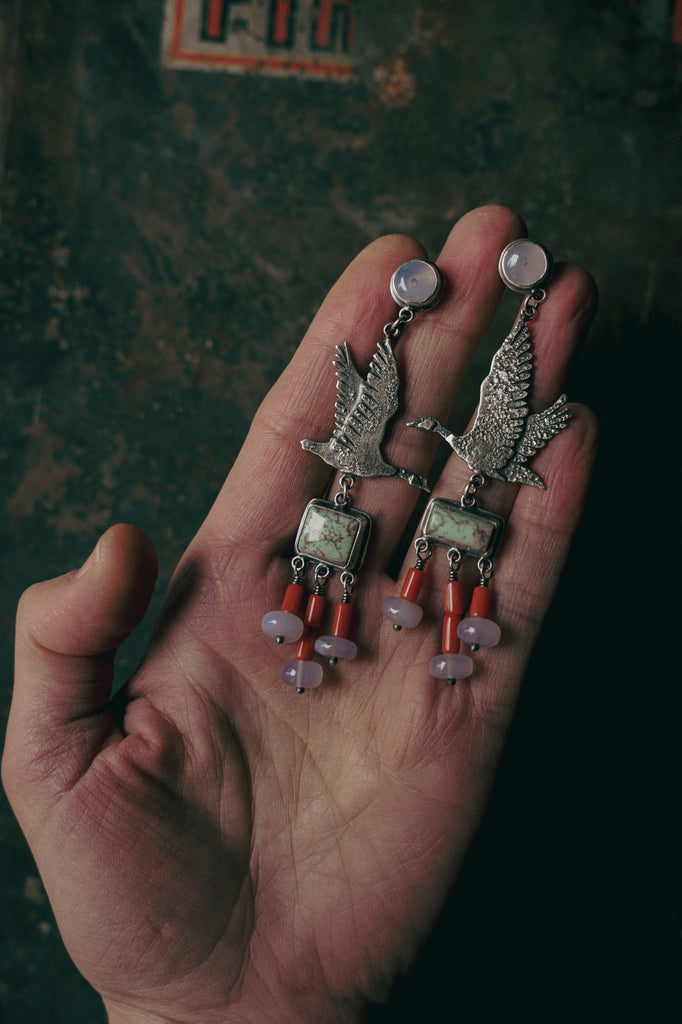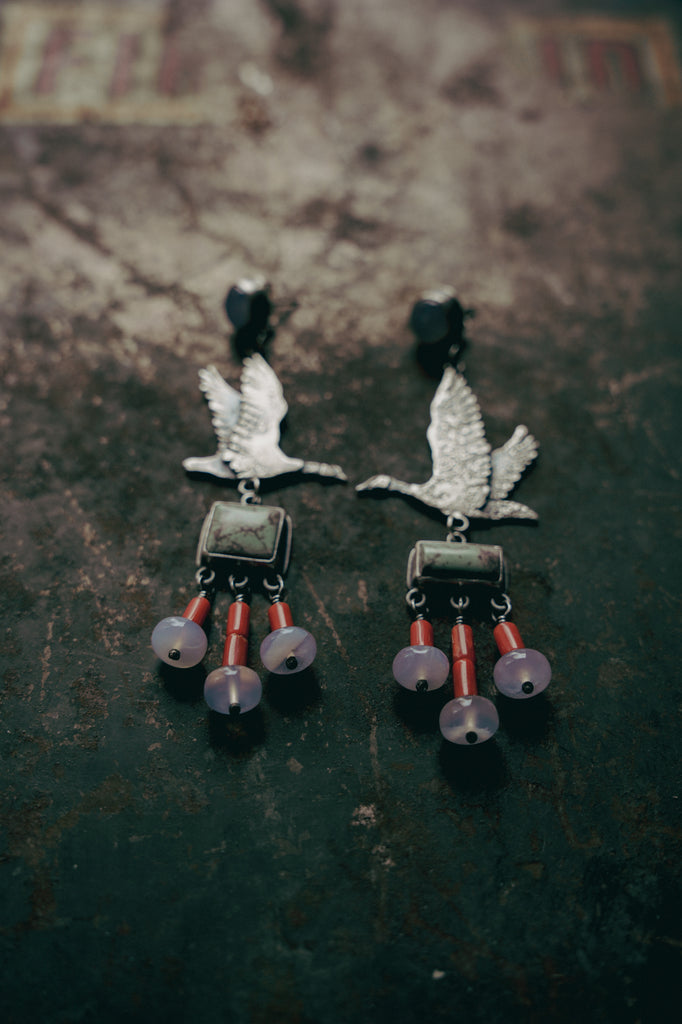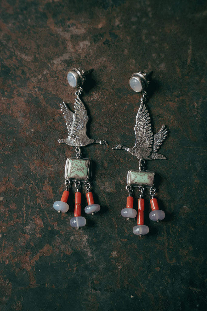 Wild Geese Earrings -- Chalcedony, Italian Coral and Variscite